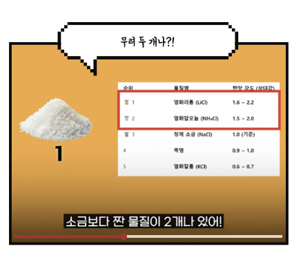 세상에서 가장 짠 음식은 소금이에요. 하지만 음식이 아니라 물질로 범위를 넓히면, 소금보다 더 짠 물질이 있어요. 짠맛을 숫자로 나타내는 ‘짠맛 강도 평가 기준’에 따르면, 소금보다 강한 짠맛을 내는 물질은 무려 두 가지나 있답니다. 과연 어떤 물질일까요?