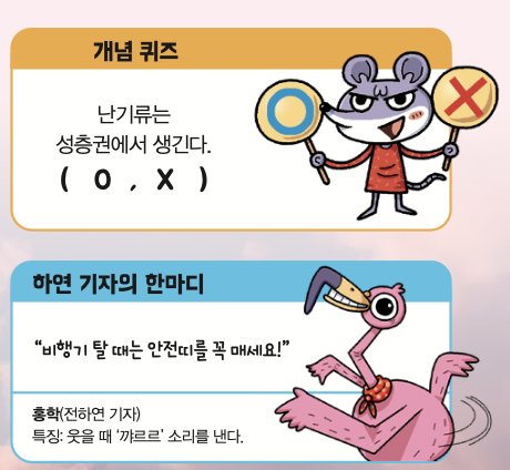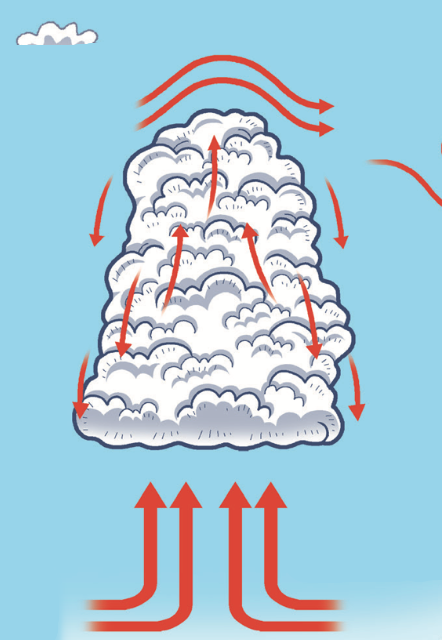 햇볕이 지표면을 달구면 뜨거워진 공기가 위로 솟아오르면서 주변에 있던 상대적으로 차가운 공기가 내려와요. 그러면 뜨거운 공기와 차가운 공기가 뒤섞이면서 대류성 난기류가 생깁니다. 대류성 난기류가 생길 때는 적란운도 잘 볼 수 있어요. 적란운은 위로 솟아오른 형태이고 아래쪽은 비를 머금은 구름입니다. 햇볕에 달궈진 뜨거운 공기가 상승하면서 구름이 솟아오르고, 상대적으로 차가운 공기가 아래로 내려가 아래쪽은 비를 머금은 것이지요. 적란운 안에서 올라가는 기류와 내려가는 기류가 계속 생기면서 난기류가 강해진답니다.