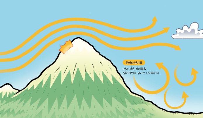 산과 같은 장애물을 넘어가면서 생기는 난기류이다.