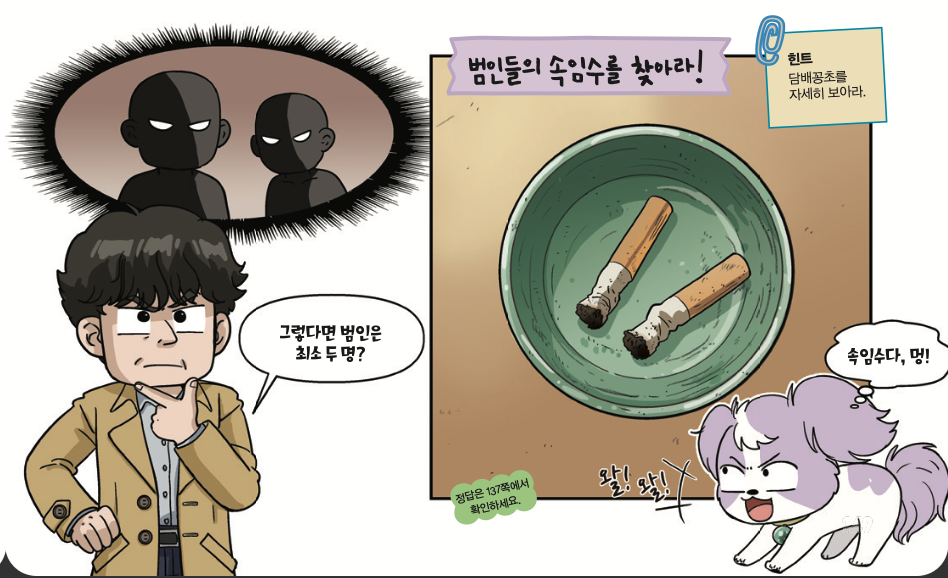 “더럽게 찻잔에 꽁초를! 담배가 두 종류군. 그렇다면 범인은 최소 두 명! 담배꽁초에 침이 묻었을 테니 유전자 검사로 범인을 잡자고.”