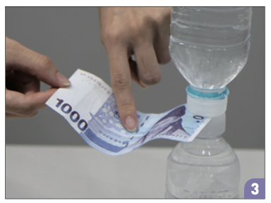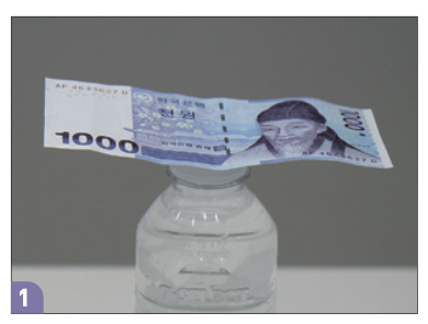 ➔ 결과: 병은 넘어지지 않고, 두 병 사이에 낀 지폐만 빠져나온다.