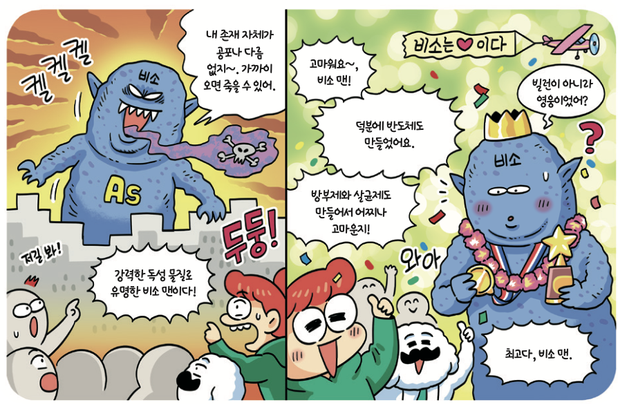 비소는 몸에 흡수되면 위장과 호흡기 등 다양한 기관에 질병을 일으킵니다. 몸속 단백질에 결합해 기관의 활동을 방해하기 때문이에요. 이 때문에 중세시대까지 비소를 독극물로 활용한 암살 사건이 자주 발생했어요. 1836년 영국의 화학자 제임스 마쉬가 화합물에서 비소를 검출하는 기술을 개발하면서, 비소 살인사건의 증거를 더 쉽게 찾아내 범죄를 줄였어요.