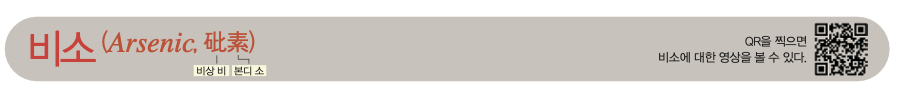 비소는 원자번호가 33번인 원소예요. 비소는 3가지 동소체가 있어요. 동소체는 같은 원소지만 원자들이 결합된 구조가 다른 물질이에요. 동소체 중 회색 비소는 원자가 여러 층이고, 노란색 비소는 정사면체 구조고, 검은색 비소는 원자가 불규칙하게 배열돼 있어요. 가장 안정된 상태로 자연에서 쉽게 발견할 수 있는 비소는 회색이지요. 비소가 갈륨과 결합한 갈륨 비소는 전자가 잘 이동해 반도체에 주로 쓰입니다. 그밖에도 비소 화합물은 방부제와 살충제로도 활용돼요.