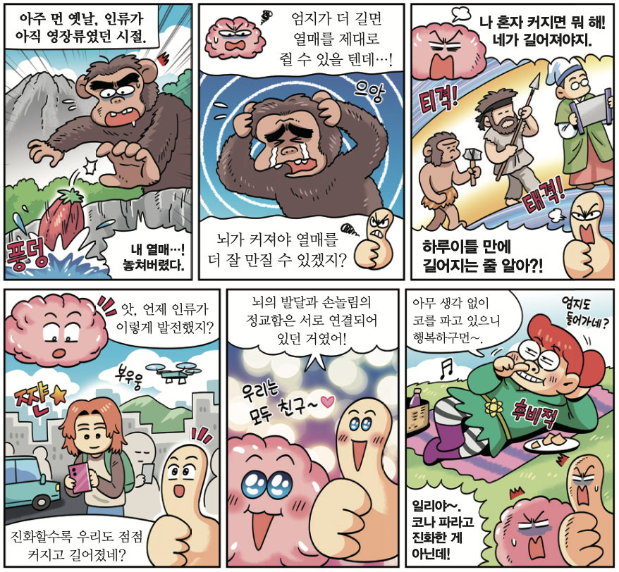 8월 26일, 영국 레딩대학교 외 공동연구팀은 엄지손가락과 뇌가 서로 영향을 주고받으며 진화했다는 연구 결과를 발표했어요. 연구팀은 고대 인류와 침팬지 등 영장류 95종의 손가락뼈 길이, 머리뼈 크기 등을 측정했어요. 엄지손가락 길이는 손의 움직임 범위와 관련이 있어, 연구팀은 엄지손가락 길이가 영장류 진화에 영향을 미쳤을 것으로 예상했어요. 연구 결과, 다른 손가락보다 엄지손가락이 긴 종은 인지와 운동을 담당하는 뇌의 ‘신피질’이 더 컸어요. 연구팀은 “영장류가 도구를 쥐고 다루는 기술을 능숙하게 처리하기 위해 뇌가 성장해야 했을 것”이라고 분석했답니다.