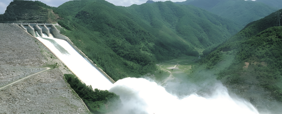 우리나라 정부는 1960년대부터 전국 곳곳에 댐을 지었어요. 625 전쟁 이후 황폐해진 땅에 새로운 시설을 짓고 경제를 발전시키기 위해서였죠. 강원특별자치도 춘천시에 있는 소양강댐은 1967년부터 짓기 시작해 1973년 완공됐습니다. 길이 530m, 높이 123m, 최대로 저장할 수 있는 물의 양은 29억 t(톤)에 달해요. 매년 수도권 지역에서 쓸 물을 12억 t씩 공급하고, 댐에 함께 설치한 발전기로는 353GWh●의 전력을 생산합니다. 1년 동안 10만 가구가 넉넉하게 쓸 수 있는 전력으로, 우리나라에서 만들어지는 수력발전의 약 30%에 달하는 양이에요.