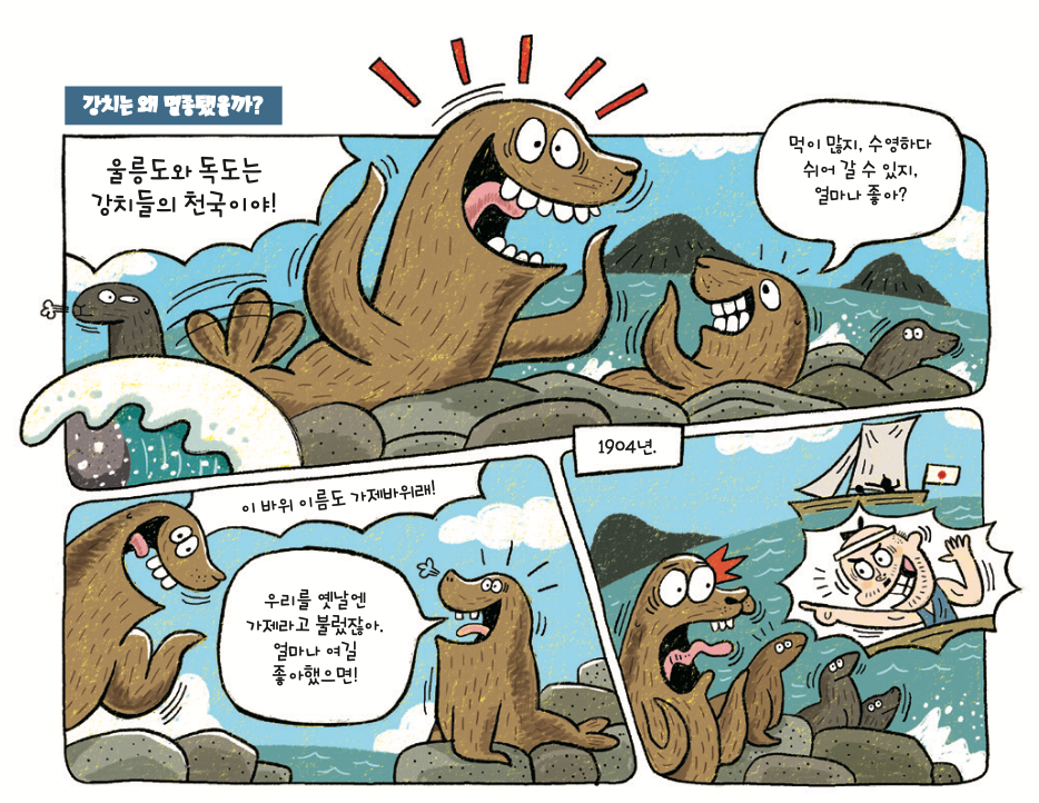 강치는 일본이 독도의 소유권을 주장하는 데 꾸준히 이용됐어요. 1900년대 초반 일본의 어부들은 강치를 잡아 큰돈을 벌었어요. 1904년, 일본의 한 어부는 강치 어업을 독차지하기 위해 “독도를 일본 영토에 포함시켜 달라”고 일본 정부에 청원했어요. 일본은 독도가 주인 없는 섬이라며 일본 영토의 일부에 포함하겠다고 우리나라도 모르게 선포했죠. 몇 달 후 일본에선 독도를 ‘다케시마’로 표기한 지도가 등장해요. 오늘날에도 일본은 독도의 소유권을 주장하는 활동에 강치를 앞세워요.