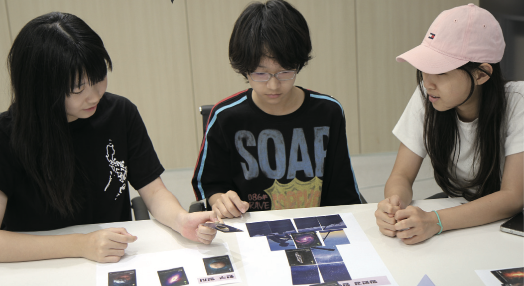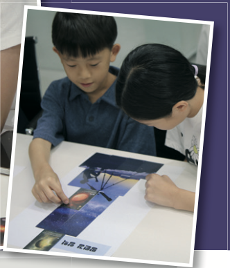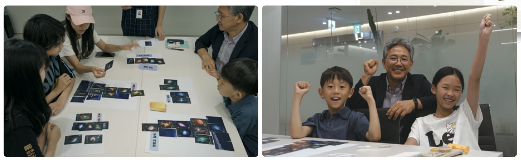 본격적인 강연과 인터뷰 시작 전, 현 프로그램장과 어린이 기자들은 함께 우주를 관측하는 콘셉트의 카드 게임을 하며 우주에 있는 다양한 천체의 종류를 배웠어요. 망원경 영역과 연구 일지로 나누어진 게임판에 다양한 숫자의 카드를 적절히 배치하며 점수를 얻는 게임이었죠. 김지아, 조유경, 이현서 어린이 기자가 ‘김조이 팀’을, 김래오, 최서은, 현 프로그램장이 ‘드래곤 팀’을 이루어 치열한 경쟁을 펼쳤어요. 더 많은 점수를 얻기 위해선 카드에 적힌 숫자뿐만 아니라 행성, 인공위성, 블랙홀 등 카드 종류도 까다롭게 살펴야 했죠. 연습 게임에서는 김조이 팀이, 본 게임에서는 드래곤 팀이 승리를 거뒀어요.