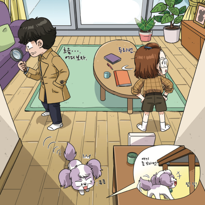 내가 책상 밑에서 그림을 올려다보며 짖어대자, 명 탐정과 이 프로가 식탁을 옆으로 세워 놓고 그림을 살폈다.