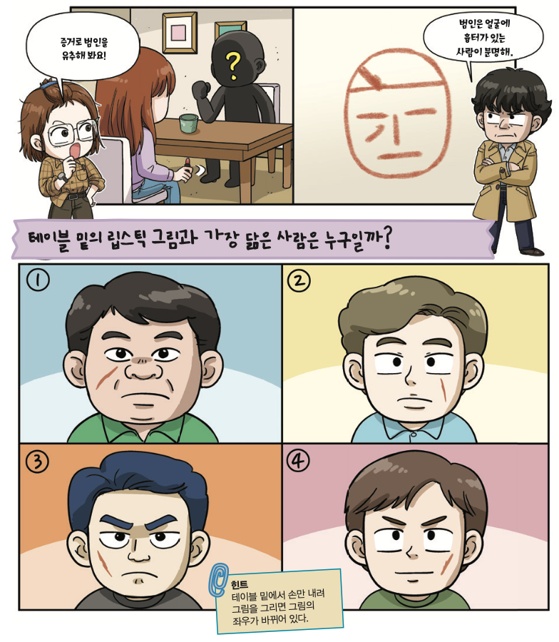 “그래! 그렇다면 범인은 얼굴에 흉터나 상처가 있는 사람이고, 가르마 방향은…?”