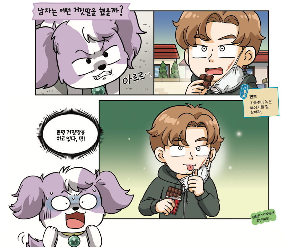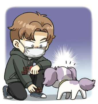 나는 남자의 수상쩍은 행동을 의심하며 이빨을 드러냈다. 그러자 남자는 마스크 한 쪽을 벗고 손에 든 초콜릿을 자기 입에 쏙 집어넣었다.