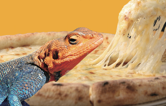 치즈피자요. 우리는 토고의 한 해변가에서 무지개도마뱀 9마리에게 4가지 치즈가 든 ‘콰트로 포를 피자’와 피망 등 다양한 재료가 섞인 ‘포 시즌 피자’를 줬어요. 관찰 결과, 피자를 놓은 지 15분이 지나자 무지개도마뱀들이 달려와서 피자를 먹기 시작했어요. 그런데 콰트로 포를 피자만 맛있게 먹었죠. 피자를 두고 서로 싸우는 모습도 관찰할 수 있었답니다.
