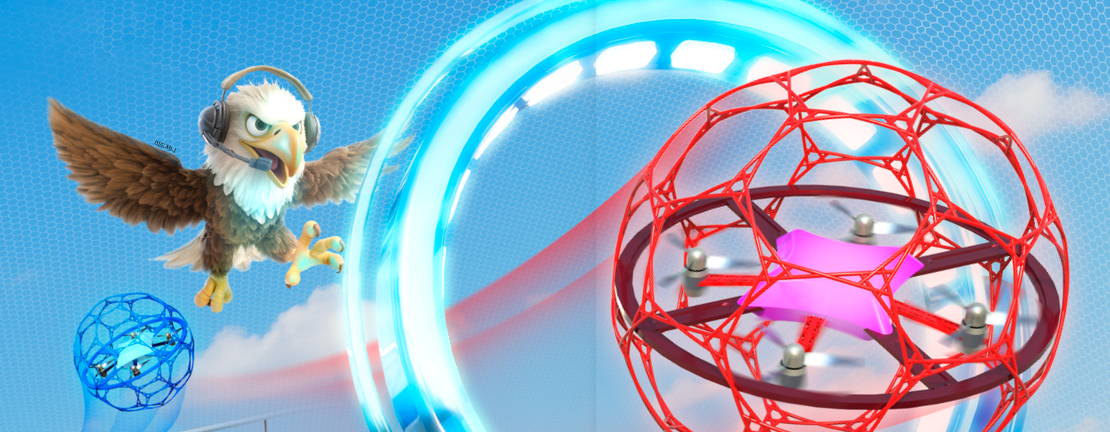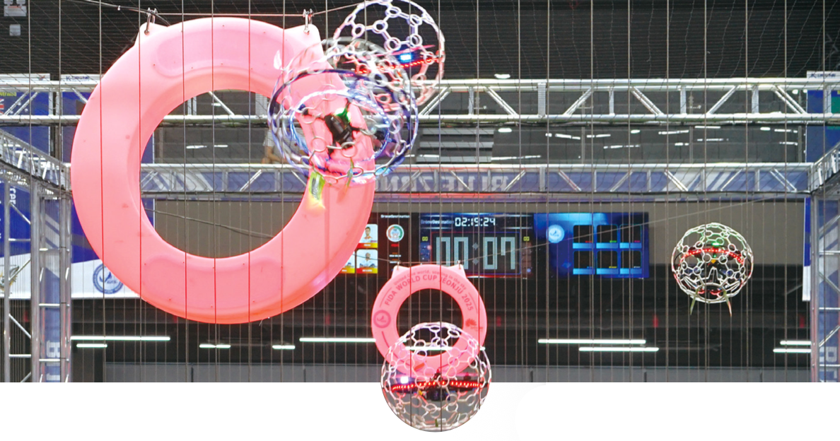 드론축구는 둥근 보호 장구에 드론이 들어 있는 ‘드론 볼’을 공중에 매달린 도넛 모양 골대에 넣는 경기예요. 한 팀은 5대의 드론 볼로 이루어지며, 각 드론은 공격, 수비 등을 맡지요. 공격 담당 드론 볼이 상대 골대를 통과하면 1점을 얻어요.