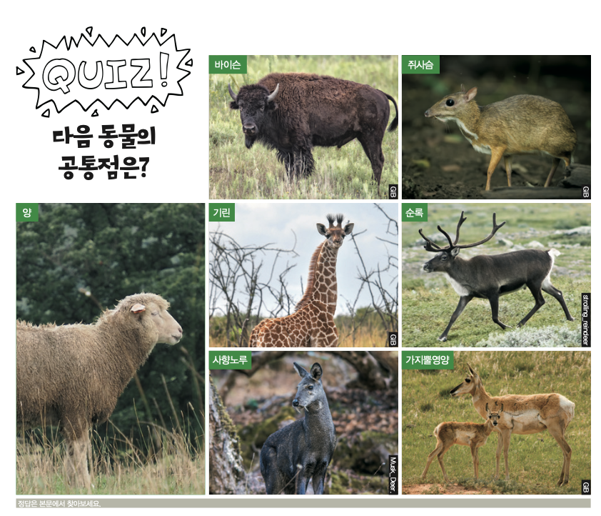 여기저기서 대원들은 손을 들며 답변했습니다. 장이권 교수는 대원들의 답을 듣더니 “정답은 모두 반추동물이라는 것”이라고 답했어요. 반추동물은 한 번 삼킨 먹이를 다시 게워 내어 입에서 되새김질하는 포유류입니다. 대표적으로 소나 양, 사슴, 기린 등이 반추동물에 속해요. 또 위가 네 개라는 특징이 있지요.