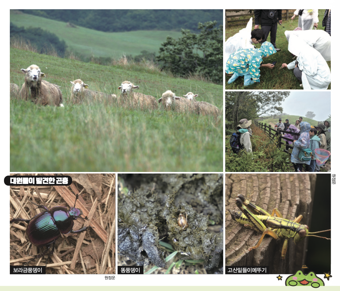 지구사랑탐사대 대원들은 강연장에서 나와 해발 1000m 정도 높이의 고산지대 목초지로 이동했어요. 넓게 펼쳐진 초록빛 목초지는 마치 제초기로 깎은 듯 짧고 일정하게 잘려 있었어요. 양들이 일정하게 풀을 씹었기 때문이에요. 목초지에는 드문드문 검은색의 양 똥들도 떨어져 있었습니다.