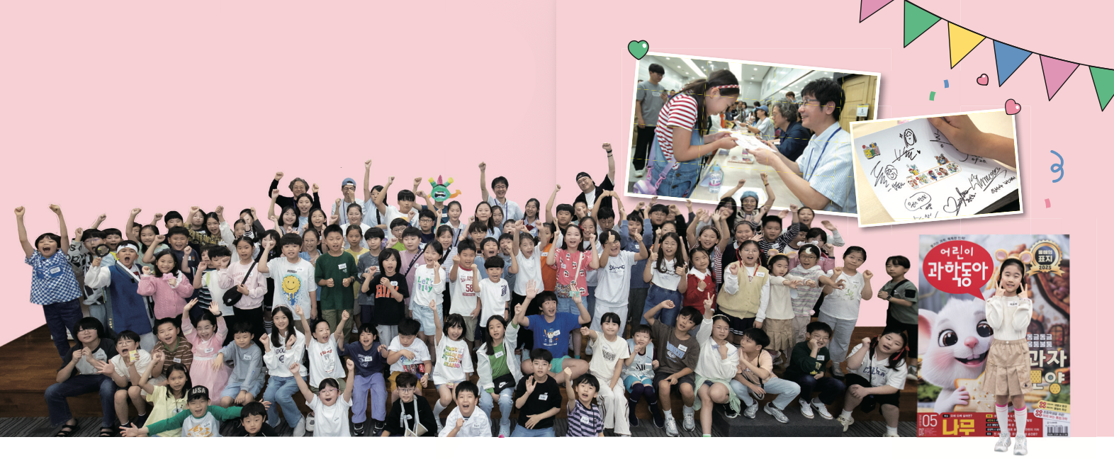 팬파티에서 만난 배서윤 독자가 <어린이과학동아> 만화 작가들의 사인이 가득 담긴 종이를 안고 들뜬 얼굴로 말했어요. 어과동 21주년을 기념한 이번 팬파티는 어과동의 슬로건인 ‘웃기는 과학, 똑똑한 만화’를 주제로 만화 작가와 독자가 함께 추억을 만들었어요. 100명의 독자가 참여하고, 어과동에 만화를 연재하는 김문식, 문인호, 박동현, 슬다, 압듈라, 홍승우 작가가 함께했습니다.