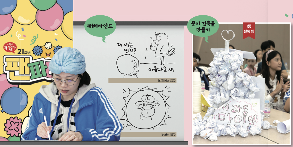 조별 구호를 외치자 분위기가 금세 달아올랐습니다. 만화 작가와 어과동 기자들이 직접 조장을 맡아 조별 대결을 펼쳤기 때문이죠. 백창은 편집장이 진행한 본행사에선 만화 작가가 그린 그림을 보고 단어를 맞히는 캐치마인드부터 실험과 만들기까지 다채로운 프로그램들이 이어졌어요.