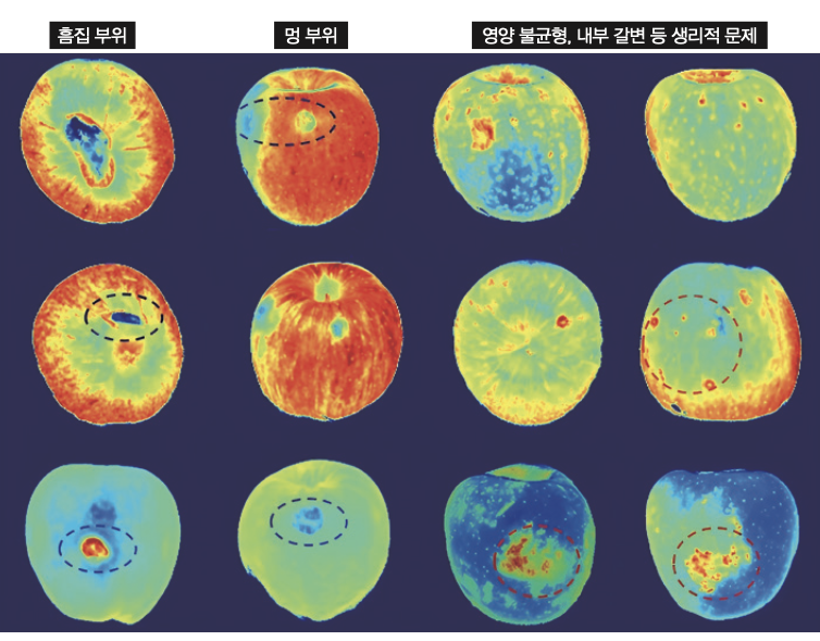 초분광 특수 카메라로 사과의 멍과 흠집 등을 찾아낼 수 있다.
