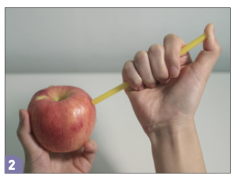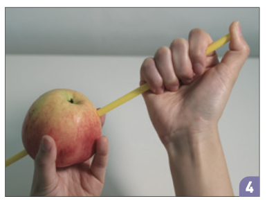 ➋ 손에 힘을 주고 빨대의 뚫린 쪽을 사과에 내리꽂는다.