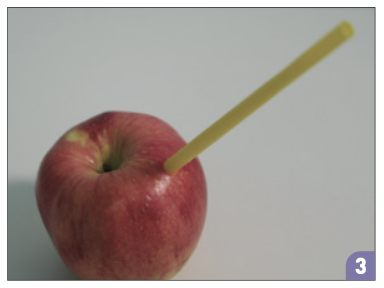 플라스틱 빨대는 쉽게 눌리고 휘어지는 재질이에요. 속이 빈 관 형태의 빨대에는 자유롭게 공기가 드나들고 있죠. 이러한 빨대를 사과에 그냥 꽂으려 하면 사과의 단단함을 이기지 못하고 구부러져요.