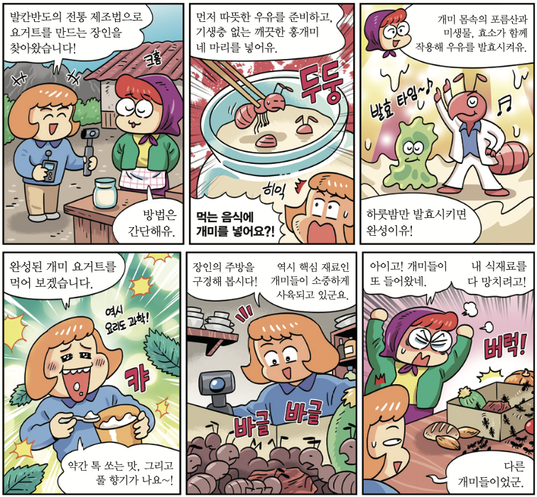 10월 17일, 덴마크 코펜하겐대학교 등 공동 연구팀은 개미를 이용해 요거트를 만든 소식을 국제 학술지 ‘아이사이언스’에 전했습니다. 연구팀은 ‘포미카 루파’라는 홍개미를 이용했어요. 따뜻한 우유에 개미 네 마리를 넣고, 우유병을 하룻밤 동안 개미집에 보관했어요. 개미집은 열을 가둬 우유의 발효에 도움이 돼요. 발효는 미생물이 유기물을 분해해 새로운 물질을 만드는 과정입니다. 그 결과, 우유는 하루 만에 새콤한 맛이 나는 요거트로 변했어요. 개미 몸 속의 유산균과 아세트산균이 우유 안의 물질인 유당을 분해해 신 맛이 나는 젖산과 아세트산을 만들었기 때문이랍니다.