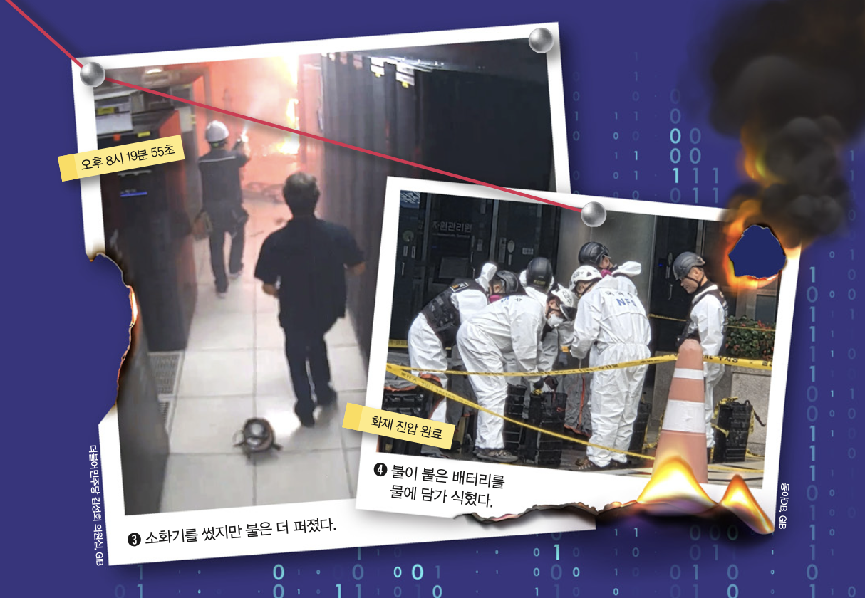 8시 18분 7초, 국정자원에서 배터리 작업자는 소화기를 들고 와 불꽃이 발생한 배터리에 뿌렸어요. 7초가 지난 뒤 배터리에서 다시 불꽃이 터지더니 배터리들이 모인 배터리팩 전체로 불꽃이 퍼졌어요. 8시 20분에 직원들이 소화기를 다시 뿌렸지만, 불은 오히려 더 크게 번졌어요. 8시 22분에는 전산실 전체에 연기가 자욱해졌습니다. 서버에 불이 붙으면서 서버에 있던 정보들도 사라졌습니다.