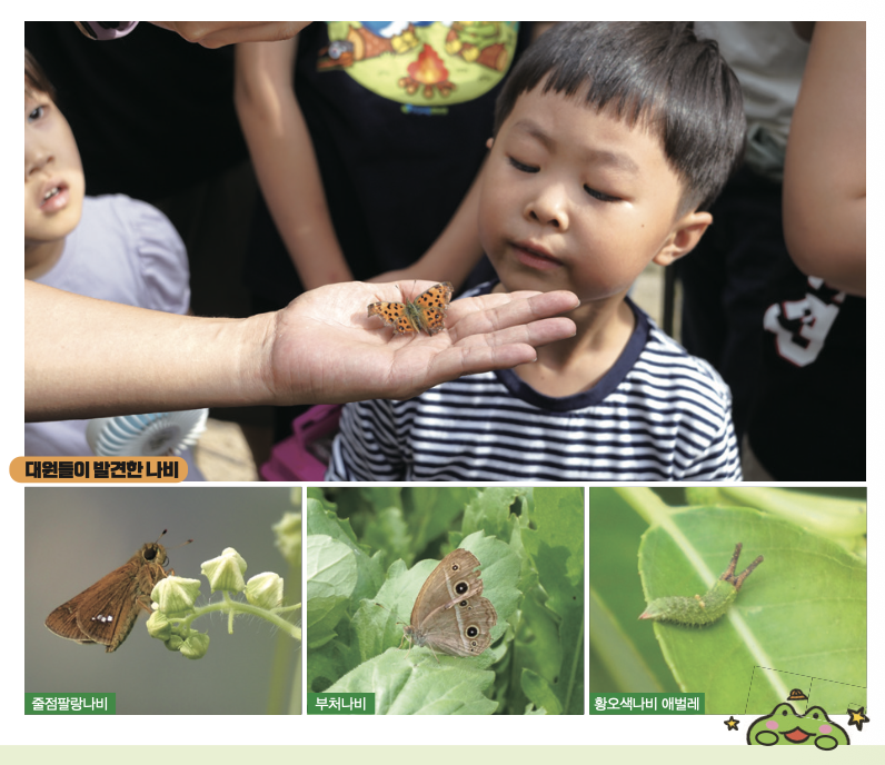 추헌철 연구원은 “갉아 먹힌 잎사귀 주변에 배설물이 있다면, 그 근처에 나비 애벌레가 살고 있을 가능성이 높다”고 설명했어요. 포충망을 들고 탐사에 나선 대원들은 추헌철 연구원의 설명에 따라 꽃밭과 나무 근처에서 나비와 애벌레를 찾았습니다.