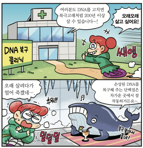 먼저, 내 DNA는 다른 동물보다 암을 일으키는 유전자를 더 잘 고치는 특징이 있었어. 연구팀은 내 DNA를 이루는 요소들도 조사했지. 그 결과, 내 DNA에 ‘CIRBP’라는 단백질이 다른 생물보다 훨씬 많았어. 이 단백질은 북극처럼 차가운 환경에서 많이 만들어져. 이중가닥 절단 현상이 일어난 부위를 수리하고 DNA의 끝부분을 보호하는 역할을 하지. DNA가 손상되어도 이 단백질이 DNA를 빠르게 복구해 암을 예방하기 때문에 오래 살 수 있는 거야.