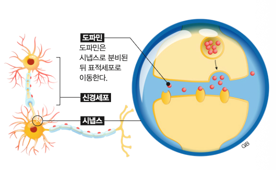 도파민의 양이 많아지면 같은 행동을 계속 반복하게 됩니다. 도파민과 같은 신경전달물질은 신경세포와 신경세포 사이의 연결고리인 시냅스로 전달되고 신경전달물질에 반응하는 표적세포까지 이동해요. 도파민이 반복적으로 분비되면 도파민을 전달하는 신경세포가 함께 작동하고, 이 과정이 반복되면 도파민이 전달되는 신호 경로가 탄탄해져요.
