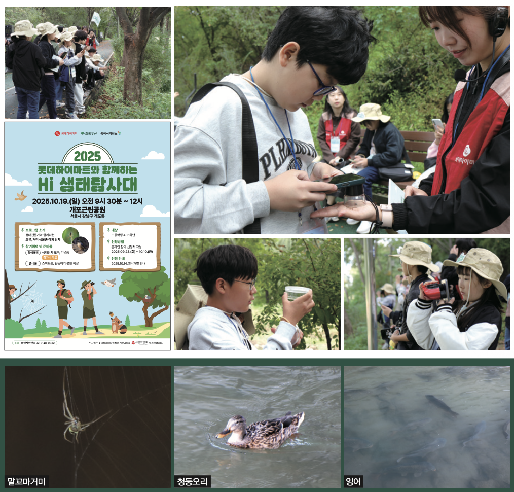 롯데하이마트가 운영하는 Hi 생태탐사대는 생태 전문가와 함께 양재천의 다양한 지역 생물종을 직접 관찰하고, 자연의 소중함과 생물다양성의 의미를 배우는 생태 교육 프로그램이에요. 이번 Hi 생태탐사대에는 34명의 초등학생 대원들이 참여했죠. 양재천으로 모인 대원들은 먼저 ‘물가로 너무 가까이 가지 않기’, ‘생물을 손으로 잡지 않고 눈으로만 관찰하기’ 등의 안전 수칙을 익혔어요. 이후 조류 팀과 거미 팀으로 나뉘어 양재천과 개포동 근린공원 주변을 돌며 생물종을 관찰했습니다.