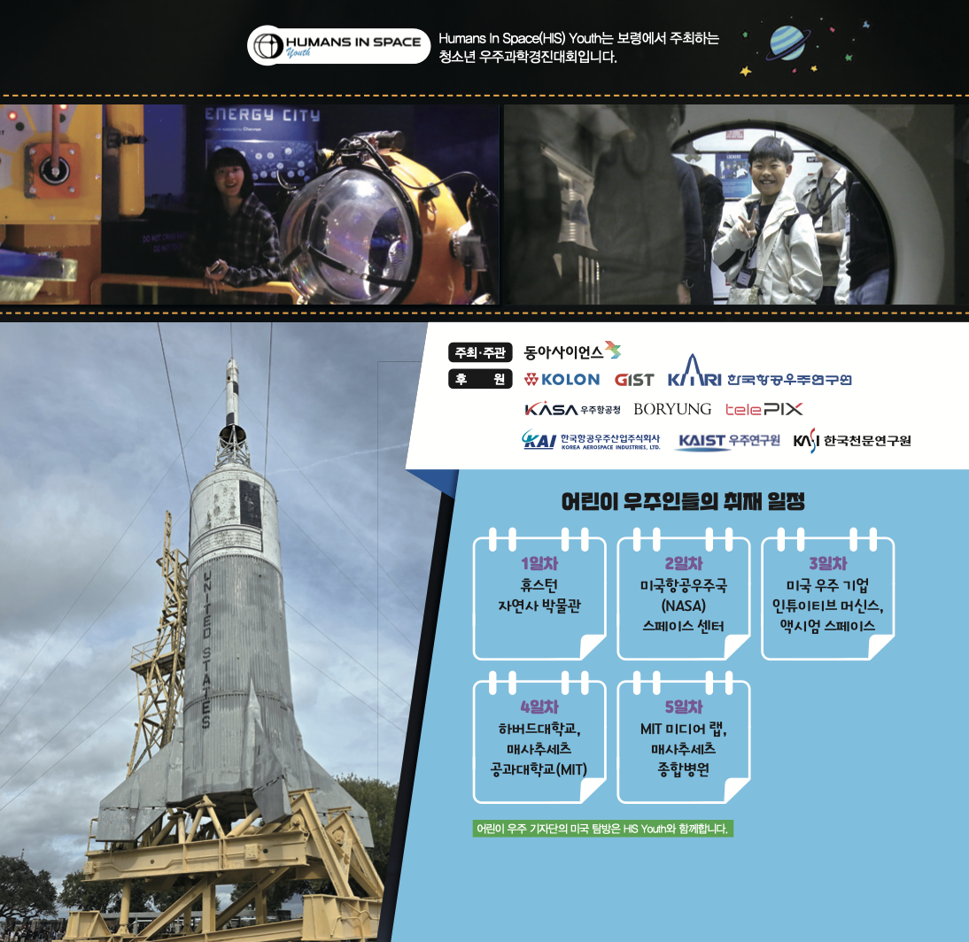 제2회 어린이 우주인 선발대회의 최종 어린이 우주인으로 선발된 조유경, 김지오 어린이 우주인이 HIS Youth 중·고등부 팀과 함께 미국 취재를 다녀왔습니다. 두 어린이 우주인이 미국에서 전해 온 생생한 우주 과학 이야기를 만나 봐요!