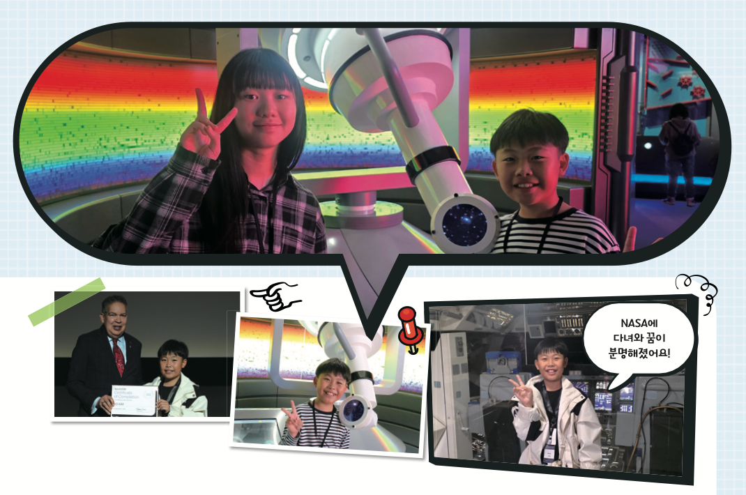 막연하게 과학자가 되는 것이 꿈이었는데, NASA와 미국 우주 기업들을 보고 나니 우주와 관련한 일을 하는 과학자가 되고 싶어졌어요. 또, 끝까지 도전하면 무엇이든 할 수 있다는 생각을 다시 하게 됐어요. 2025년 한 해 동안 어린이 우주인 선발대회에 열심히 참여한 뒤에 미국 탐방을 하니, 미국에서 경험한 모든 것이 훨씬 더 멋있게 보였거든요. 3기 어린이 우주인 선발대회에 도전할 친구들에게도 무엇이든 끝까지 해 보라고 말해 주고 싶어요. 어떤 것이든 목표를 가지고 집요하게 도전하면 좋은 결과를 얻을 수 있을 거예요!