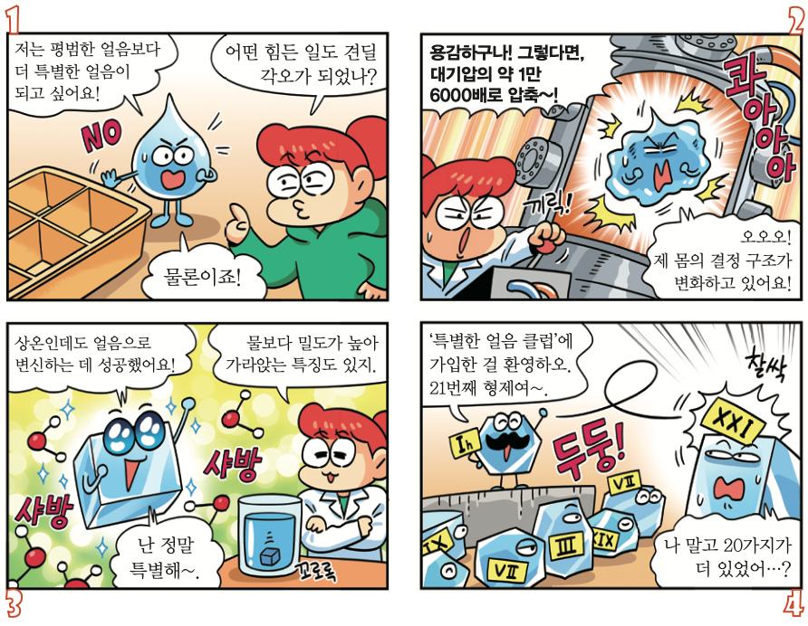 얼음은 물 분자가 서로 안정적으로 결합해 고체가 된 물질이에요. 우리가 잘 아는 얼음은 기본 구조 안에 물 분자가 4개 들어 있고, 이 기본 구조가 반복되어 얼음 결정을 이뤄요. 우리를 누르는 공기의 압력이 평소처럼 1기압일 때는 물 분자가 0℃에서 가장 안정적으로 결합하면서 물이 얼어요. 하지만 압력이 달라지면 물 분자들이 가장 안정적으로 결합하는 형태와, 그 형태가 만들어지는 온도가 바뀌어요. 과학자들은 압력과 온도 조건을 다양하게 바꾸며 지금까지 20가지의 다양한 얼음 구조를 발견했어요.
