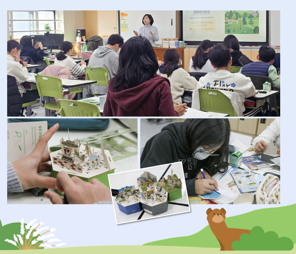 어린이들은 서울의 산, 강, 도심 등 3개 주제로 만들어진 판에 야생생물 인형을 꽂고, 색연필로 생물들이 살기 좋은 서식지를 꾸몄어요. ‘길 잃은 별들’ 조는 생태통로를 만들고 도시 중간중간에 작은 숲을 조성했죠. 생태통로는 도로, 댐, 하천으로 야생생물의 이동 경로나 서식지가 가로막히지 않도록 사람이 만든 통로예요. 국립생태원에 따르면 서울시에 29곳의 생태통로가 설치됐습니다.