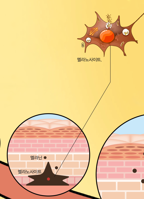 멜라노사이트는 멜라닌을 만드는 세포예요. 멜라닌은 피부나 머리카락, 눈동자의 색깔을 결정하는 색소입니다. 갈색, 검은색 등 다양한 색깔이 나타날 수 있어요. 멜라노사이트 안에는 멜라노솜이라는 주머니 모양의 작은 기관이 있어요. 멜라노솜에서 멜라닌이 만들어져 저장되고, 멜라노솜이 다른 세포로 이동하면서 멜라닌이 전달됩니다. 갈색을 띠는 멜라닌이 많으면 피부나 머리 색깔이 어두워져요. 반대로 멜라닌이 적을수록 밝은색을 띠지요.