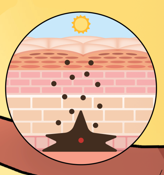 우리 몸에서는 평소에도 멜라닌이 만들어져요. 그래서 사람마다 자신의 피부색이나 머리카락 색깔이 유지될 수 있지요. 하지만 강한 햇빛을 받아 자외선에 많이 노출되면 멜라노사이트는 피부를 보호하기 위해 멜라닌을 더 많이 만듭니다. 이렇게 만들어진 멜라닌은 주변의 각질형성세포에 전달됩니다.