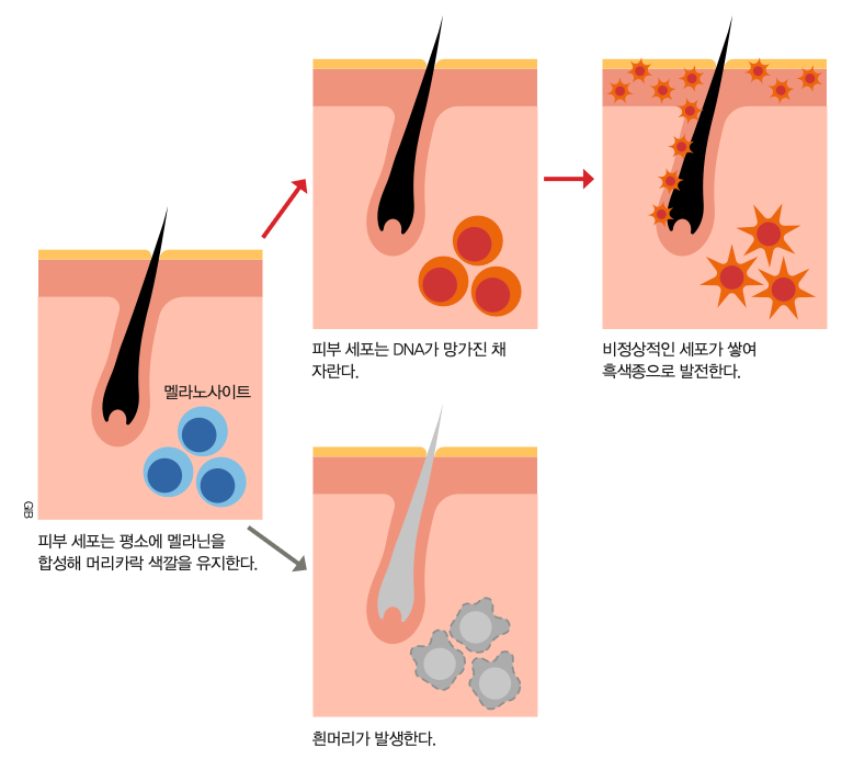흰머리는 보통 멜라닌을 만드는 세포인 멜라노사이트의 수가 줄어들면서 생깁니다. 멜라노사이트가 줄어들어 머리카락 안의 멜라닌이 감소하면 머리카락이 하얗게 보여요. 머리카락에서 멜라닌이 사라진 빈 공간이 빛을 모두 반사하는데, 이것이 우리 눈에 하얗게 보이기 때문이에요. 그런데 이런 흰머리가 우리 몸이 암세포를 막기 위해 만들어낸 것일 수 있다는 연구 결과가 발표된 거예요. 우리 몸이 자외선에서 피부를 지키려고 멜라닌을 더 많이 만들듯이, 멜라닌 양을 적게 조절해서 암으로부터 몸을 지킬 수 있다는 거예요.
