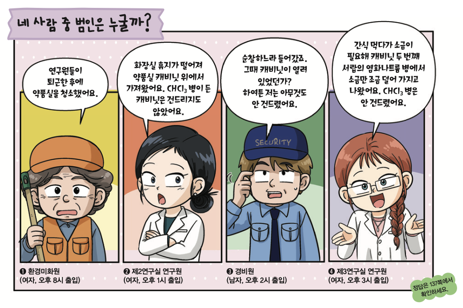 “캐비닛 안에 CHCI3 병이 없군. 범인은 분명 여기서 훔쳐 간 거야.”