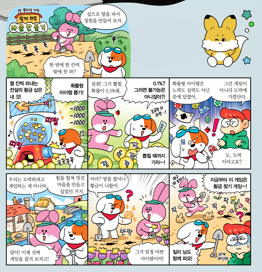 앞으로 게임할 때 지금 하고 있는 게임이 뽑기인지, 게임인지 스스로에게 물어보세요. 그리고 게임을 하는 중에 즐거움을 느끼는지, 불안하고 괴로운 감정이 드는지도 확인해 보세요. ‘한 번만 더’라는 생각이 들면, 잠시 게임을 끄고 산책하거나 게임이 아닌 다른 생각을 해 보세요. 확률형 아이템을 끊기 힘들다면, 한국콘텐츠진흥원이나 청소년 도박문제 상담전화에서 상담받는 것도 좋아요. 진짜 게임의 즐거움은 도전과 성장에 있다는 걸 명심하세요!