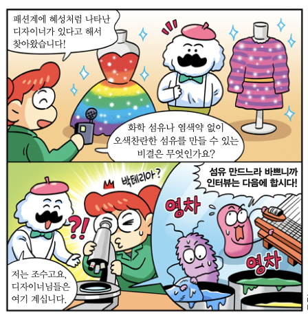 안녕! 우리는 친환경 옷을 만드는 세균 팀이야. 우리 팀은 옷감을 짜는 나, ‘코마가테이박터 자일리누스’라는 박테리아와 옷감을 염색하는 대장균이 있어. 나는 셀룰로오스를 만들 수 있어. 셀룰로오스는 식물 세포벽의 주성분으로, 튼튼하고 가벼워서 옷감으로 쓰기 좋지. 면 티셔츠를 만드는 목화솜도 셀룰로오스로 이루어졌어. 대장균은 원래 사람의 장에 사는 세균이야. 전에는 색소를 만들지 못했지만, 지금은 무지개 색의 다양한 색소를 만들어 낼 수 있어.