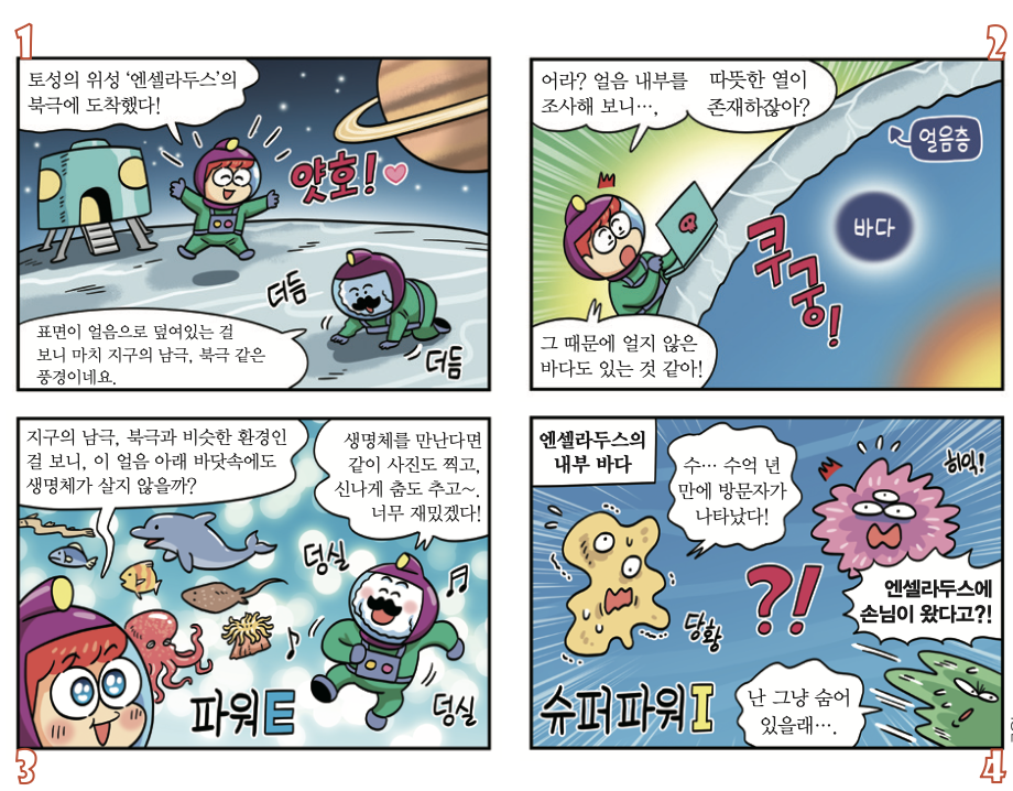 2005년, 미국항공우주국의 토성 무인 탐사선 ‘카시니호’는 엔셀라두스 남극에서 바닷물이 솟구치는 물기둥을 관측했어요. 이곳에는 태양 빛이 거의 없지만, 물기둥이 나오는 부분은 주변보다 60°C나 높았죠. 연구팀은 태양이 아닌 다른 열이 얼음을 녹여 물기둥이 만들어졌다고 생각했어요. 연구팀은 남극과 비슷한 조건인 북극의 겨울도 조사했어요. 그 결과, 북극의 온도는 영하 235°C로, 태양의 영향을 받아 생긴 열보다 온도가 7°C 높았어요. 다른 곳에서 온 열이 있다는 증거였죠.