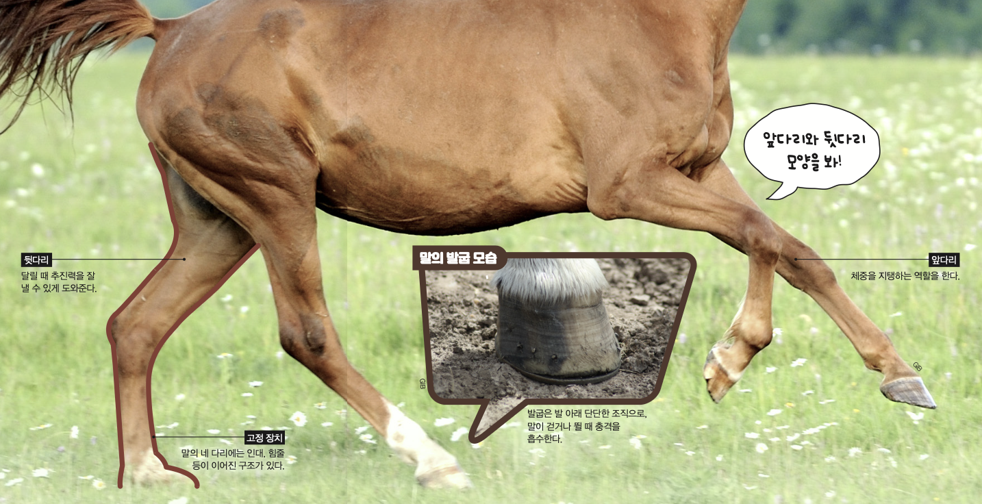 말의 다리는 역할도 조금씩 달라요. 앞다리는 달릴 때 말의 체중을 지탱하고, 뒷다리는 말이 앞으로 잘 나아갈 수 있도록 도움을 줍니다. 말의 종류에 따라 다리 근육에도 차이가 있어요. 경주마는 백색근이 많고, 조랑말은 적색근이 많지요. 적색근에는 미오글로빈이라는 단백질이 많아 산소를 잘 공급할 수 있기 때문입니다.