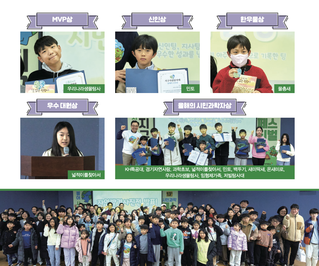 지난해 처음 활동을 시작한 팀 가운데 가장 활발하게 탐사한 민토 팀에게는 신인상이 주어졌어요. 첫 활동임에도 16개 생물종을 모두 기록해 대원들을 놀라게 했어요. 또 971건의 탐사 기록으로 지난해 최다 탐사 기록을 달성한 우리나라생물탐사 팀은 MVP 상을, 조류 탐사 기록만 668건을 올린 물총새 팀은 한우물상을 받았습니다.