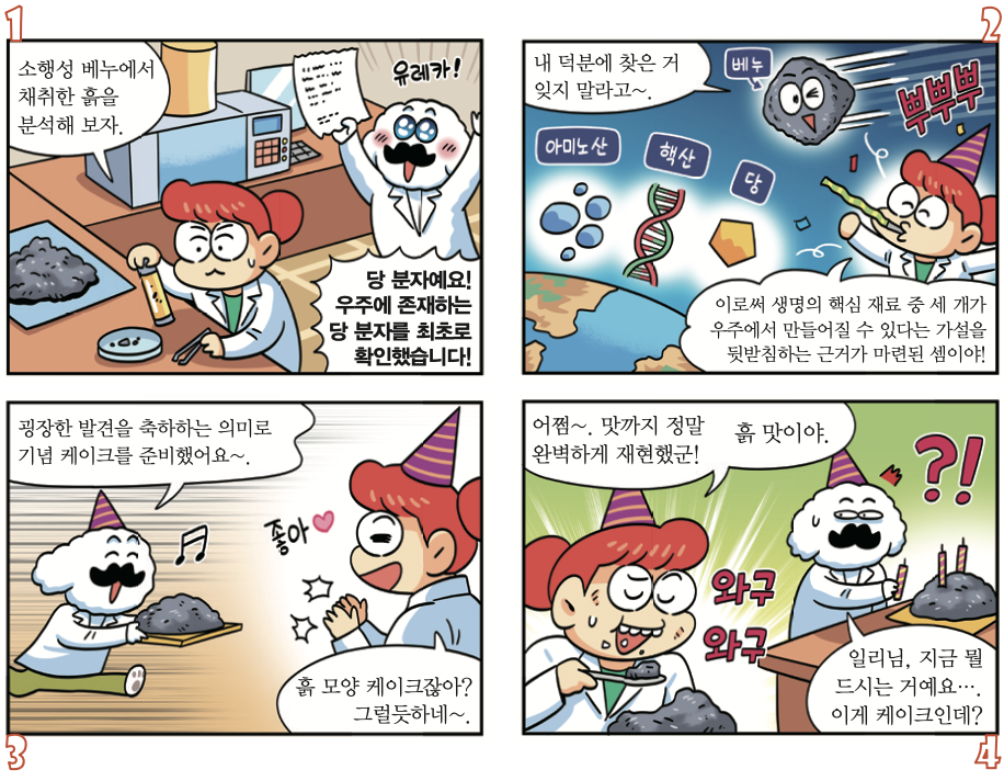 연구팀은 베누의 흙 표본 603.4mg●을 산성 용액에 녹여서 분석했어요. 분석 결과 6종류의 당이 나왔습니다. 특히 우리 몸의 에너지원인 포도당이 가장 많았고, 유전 정보를 전달하는 RNA의 재료인 리보스라는 당도 발견됐어요.