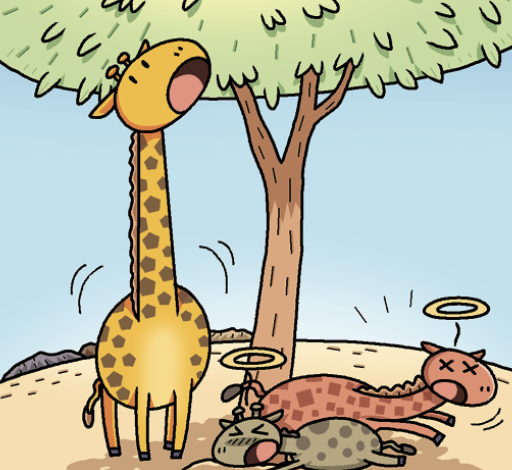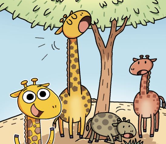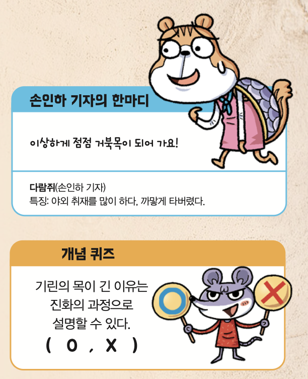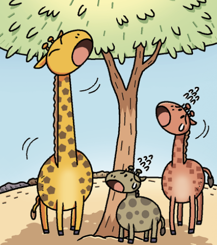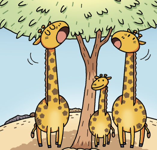예를 들어 약 5000만 년 전 기린의 조상들은 목 길이가 모두 같지 않았어요. 목이 짧은 개체도 있었고, 긴 개체도 있었죠. 높은 나무의 잎을 먹을 수 있었던 목이 긴 기린은 먹이를 얻는 데 유리해 살아남고 번식할 가능성이 높았어요. 반대로 목이 짧은 기린은 상대적으로 불리했지요. 이런 차이가 수백만 년 동안 반복되면서, 목이 긴 기린이 주를 이루게 됐어요.