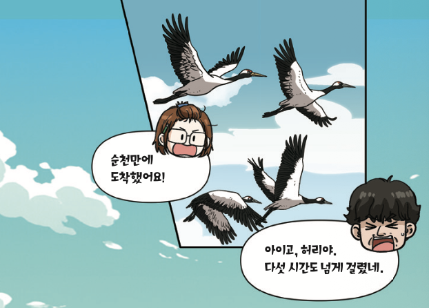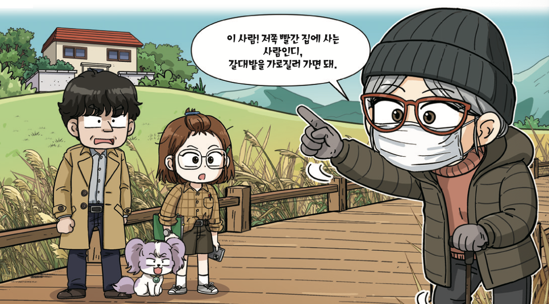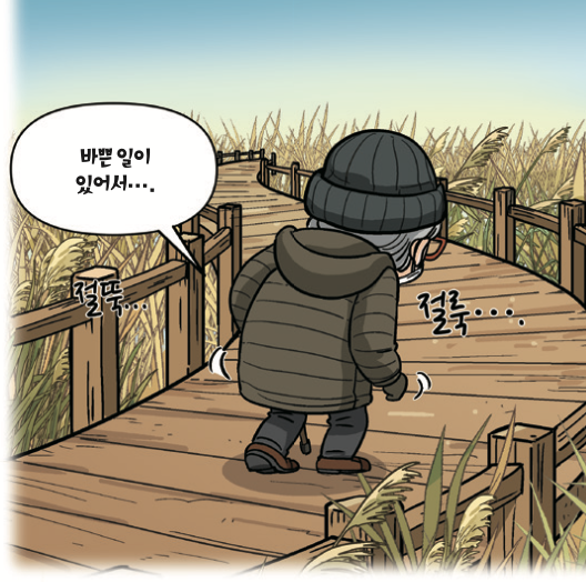 “돌아가면 억수로 멀어. 쪼매만 가면 되니 그냥 퍼뜩 갈대밭을 가로질러 가. 아, 내가 여기서 이바구 하고 있을 때가 아닌디.”