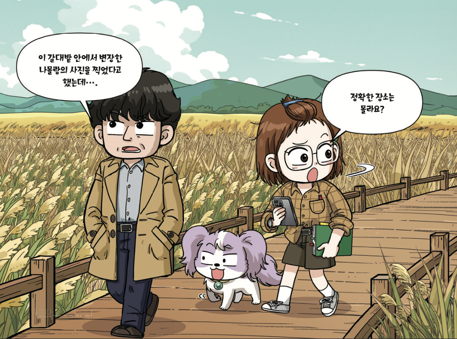 나와 명탐정, 이 프로는 나몰랑을 쫓아 기차를 타고 전라남도 순천만에 도착했다. 그리고 우리는 순천만 입구에서부터 갈대밭 사이로 난 산책길을 따라 걸어가며 주변을 살폈다.