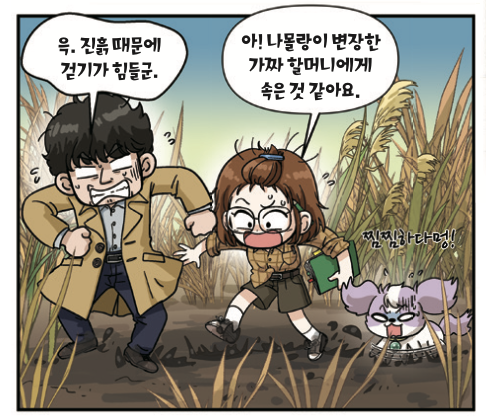 우리는 할머니가 알려준 대로 어른의 키보다 큰 갈대밭을 헤치며 앞으로 나아갔다. 하지만 1시간이 넘도록 갈대밭은 계속 이어졌다. 게다가 점점 땅이 진흙으로 변해 걷기조차 힘들었다.