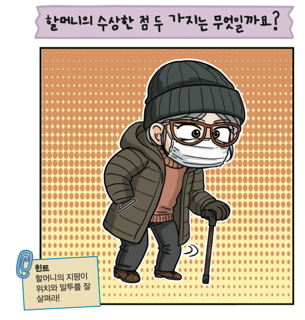 한참 동안 탐문하고 있는데, 마스크를 쓴 할머니가 지팡이를 짚고 절룩거리며 다가왔다.