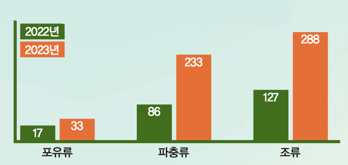 다른 나라에서 들여온 야생동물 중 버려지거나 몰래 들여온 동물은 국립생태원에서만 보호할 수 있습니다. 국립생태원 CITES동물 보호시설에는 2022년부터 매년 270마리 이상의 동물들이 들어오고 있어요. 2024년에는 430마리나 왔지요. 그 외에 버려지는 야생동물은 국립생태원의 유기방치 야생동물 보호시설로 매년 20여 마리 정도 들어오고 있어요.