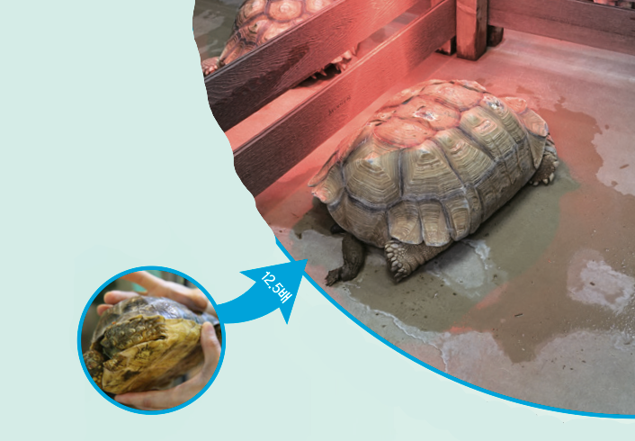 파충류 보호시설에서 새끼 설카타육지거북을 손으로 든 국립생태원 강규호 연구원이 성체가 된 설카타육지거북을 보며 설명했어요. 야생동물이 버려지는 대표적인 이유는 너무 커지거나 키우기 어렵기 때문이에요. 강 연구원이 가리키는 거북도 등껍질 길이만 70cm이고, 무게는 35kg이라 사람이 들기 쉽지 않았어요.